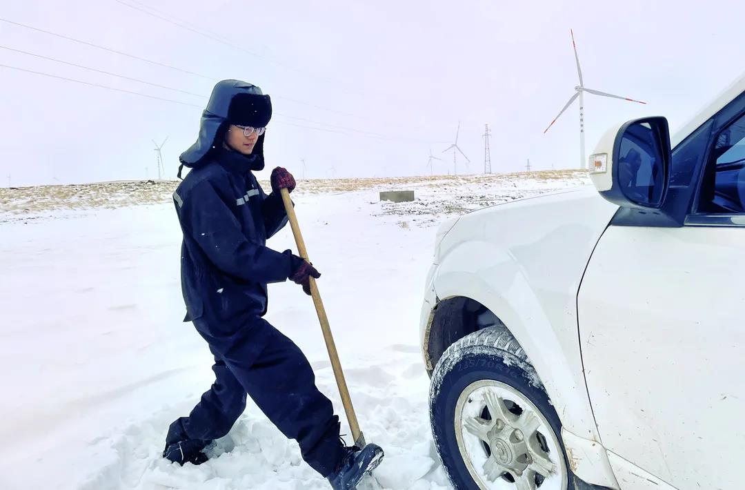 進入11月,內蒙古自治區(qū)錫林郭勒盟地區(qū)迎來大面積的暴風雪,烏達萊項目人員在趕往風場的路上遭遇積雪路段,雖然氣候嚴寒,但為了及時消除機組故障,大家在積雪路段采取挖雪推車的方式齊心協力,一同開展清理路面積雪的行動。這個冬日,冰雪阻擋不住海裝追風者們勇往直前的步伐,他們只為恪盡職守完成一個承諾——風機旋轉、帶來光熱。