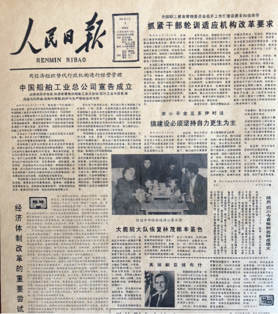 “改革開放是決定當(dāng)代中國命運(yùn)的關(guān)鍵一招。”1982年5月7日《人民日報(bào)》頭版刊載文章:“用經(jīng)濟(jì)組織替代行政機(jī)構(gòu)進(jìn)行經(jīng)營管理——中國船舶工業(yè)總公司宣布成立”,標(biāo)題下文又著重強(qiáng)調(diào)“以提高經(jīng)濟(jì)效益,加速我國船舶工業(yè)為目標(biāo),實(shí)行工業(yè)與貿(mào)易,軍用品與民用品,造船與修船,科研與生產(chǎn)相結(jié)合的方針”。頭版還發(fā)表了以“經(jīng)濟(jì)體制改革的重要嘗試”為標(biāo)題的“社論”。在這期《人民日報(bào)》的頭版還刊發(fā)了鄧小平同志接待外賓時的講話“搞建設(shè),必須堅(jiān)持自力更生為主”。