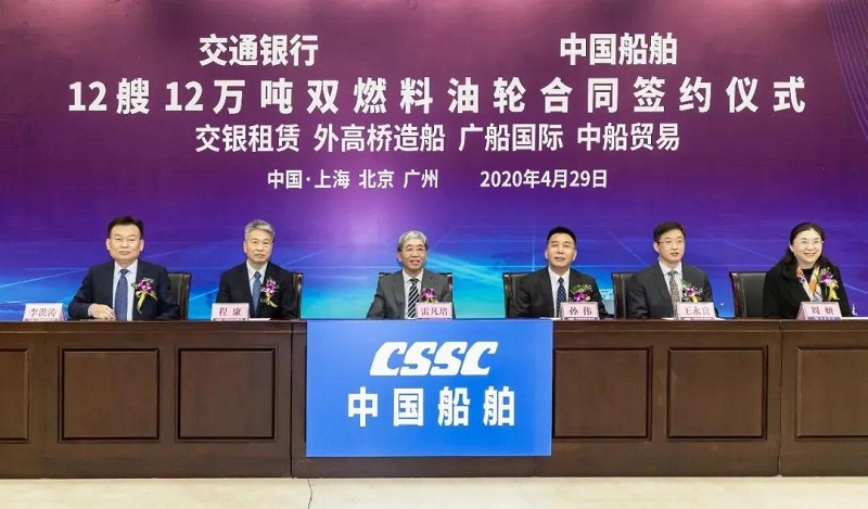 ????4月29日,中國船舶集團有限公司旗下中國船舶工業(yè)貿(mào)易有限公司、上海外高橋造船有限公司、廣船國際有限公司與交通銀行股份有限公司旗下交銀金融租賃有限責(zé)任公司在北京、上海、廣州三地以“云簽約”方式簽署12艘12萬噸雙燃料油船建造合同,合同總金額約46億元人民幣,這是中國船舶集團旗下單位近期承接的又一單筆大額訂單。中國船舶集團黨組書記、董事長雷凡培,交通銀行黨委書記、董事長任德奇,中國船舶集團黨組成員、副總經(jīng)理孫偉,交通銀行黨委委員、副行長呂家進出席簽約儀式。
