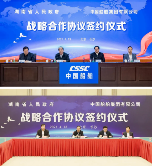 4月13日,中國船舶集團(tuán)有限公司與湖南省人民政府通過“云簽約”方式簽署戰(zhàn)略合作協(xié)議。中國船舶集團(tuán)黨組書記、董事長雷凡培,黨組副書記、總經(jīng)理?xiàng)罱鸪?,黨組成員、副總經(jīng)理盛紀(jì)綱,湖南省委書記、省人大常委會(huì)主任許達(dá)哲,省委常委、省委秘書長張劍飛,省委常委、省國資委黨委書記姚來英出席簽約儀式。中國船舶集團(tuán)黨組成員、副總經(jīng)理錢建平,湖南省人民政府副省長陳飛分別代表雙方在協(xié)議上簽字。簽約前,雙方圍繞共同服務(wù)國家戰(zhàn)略、深入推進(jìn)雙方戰(zhàn)略合作進(jìn)行了交流。