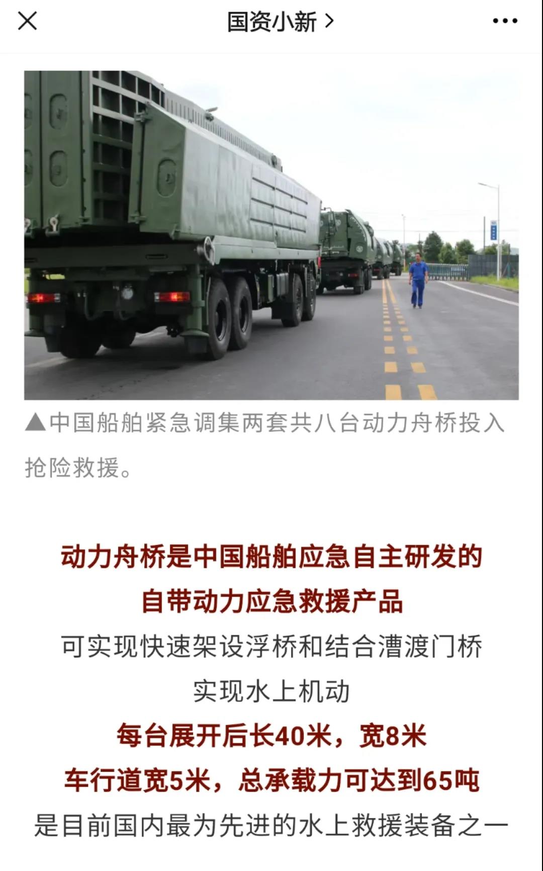 在本次搶險救援任務(wù)中,中船應(yīng)急制造的應(yīng)急動力舟橋被稱作“救援航母”,先后被多家媒體報道多次霸屏。