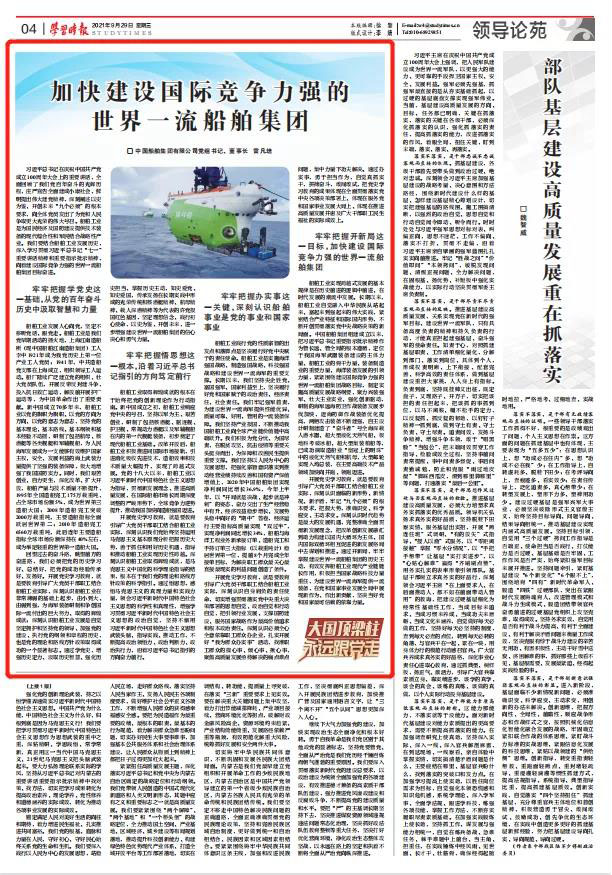 習近平總書記在慶祝中國共產黨成立100周年大會上的重要講話,全面回顧了我們黨百年奮斗的光輝歷程,莊嚴宣告全面建成小康社會,鮮明提出偉大建黨精神,深刻闡述以史為鑒、開創(chuàng)未來“九個必須”的根本要求,向全體黨員發(fā)出了為黨和人民爭取更大光榮的偉大號召。船舶工業(yè)是為國民經濟及國防建設提供技術裝備的現代綜合性和軍民結合戰(zhàn)略性產業(yè)。我們要結合船舶工業(yè)發(fā)展歷史,深入學習貫徹習近平總書記“七一”重要講話精神和重要指示批示精神,向著建設國際競爭力強的世界一流船舶集團目標奮進。