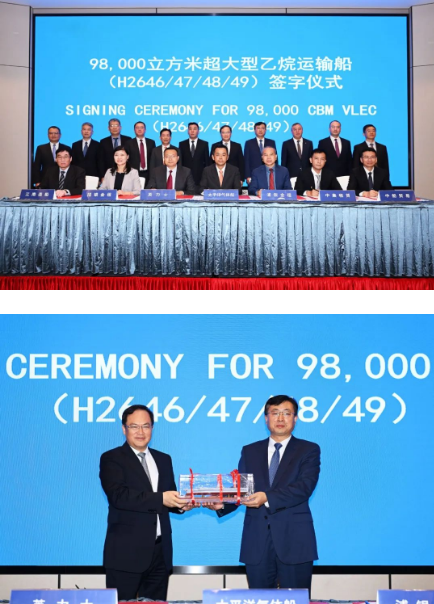 11月2日,中國(guó)船舶集團(tuán)旗下江南造船(集團(tuán))有限責(zé)任公司承建的,山東海洋集團(tuán)下屬太平洋氣體船4艘超大型乙烷運(yùn)輸船項(xiàng)目簽約儀式在上海舉行。中國(guó)船舶集團(tuán)黨組副書記、總經(jīng)理?xiàng)罱鸪?,黨組成員、副總經(jīng)理孫偉,山東海洋集團(tuán)黨委書記、董事長(zhǎng)姜國(guó)棟,黨委委員、副總經(jīng)理于冰出席儀式。