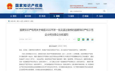 10月31日,國家知識產(chǎn)權(quán)局發(fā)布了《關(guān)于確定2022年新一批及通過復核的國家知識產(chǎn)權(quán)示范企業(yè)和優(yōu)勢企業(yè)的通知》(國知發(fā)運函字〔2022〕160號)。