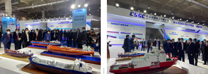 在創(chuàng)新船海裝備展區(qū),中國(guó)船舶集團(tuán)集中展示了清潔能源船舶、系列LNG船、系列集裝箱船、系列油船、系列散貨船、系列科考船、系列特種船和未來(lái)船舶八個(gè)板塊。