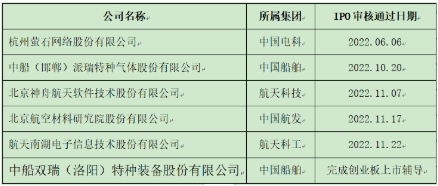 2022年的資本市場(chǎng),行情不熱行業(yè)熱。從已經(jīng)公開披露的信息看,2022年中央企業(yè)專精特新小巨人在科創(chuàng)板和創(chuàng)業(yè)板持續(xù)發(fā)力,目前已有中無人機(jī)(航空工業(yè))、國博電子(中國電科)、振華風(fēng)光(中國電子)、昆船智能等7家企業(yè)IPO上市。此外,截至2022年11月30日,已有多家央企專精特新企業(yè)IPO申請(qǐng)通過了科創(chuàng)板上市委審核和創(chuàng)業(yè)板上市輔導(dǎo),其中有兩家中國船舶集團(tuán)旗下企業(yè)(見下表)。這些企業(yè)將在2023年IPO上市,主要來自船舶、航空、航天和軍工電子行業(yè)。