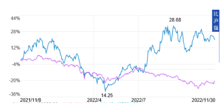 很顯然,中船系憑其創(chuàng)新和產(chǎn)業(yè)鏈優(yōu)勢(shì)已成為中國資本市場(chǎng)一股新生力量。中國船舶集團(tuán)龍頭股中國船舶(600150)2022年11月30日收盤價(jià)比去年同期上漲約20%,跑贏大市。下圖為2022年11月30日中國船舶與滬深300指數(shù)漲跌對(duì)比圖,上部曲線為中國船舶,下部曲線為滬深300。