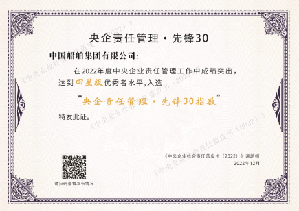 2022年12月20日,由國務(wù)院國資委社會責(zé)任局主辦、中國社會責(zé)任百人論壇承辦的“新征程 新責(zé)任——《中央企業(yè)社會責(zé)任藍皮書(2022)》《國資國企社會責(zé)任藍皮書(2022)》發(fā)布活動”在京舉行?;顒右浴霸贫藭h”的方式舉辦,發(fā)布了“央企責(zé)任管理 · 先鋒30指數(shù)”,中國船舶集團入選該指數(shù)。