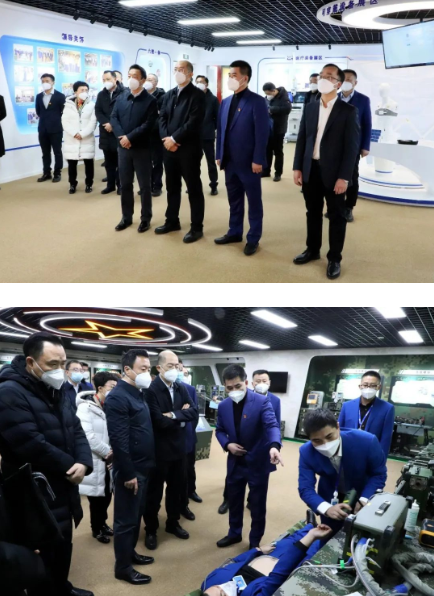 譚作鈞一行參觀了中國船舶集團旗下中船海神醫(yī)療科技有限公司應急醫(yī)療救援裝備展廳,觀摩了公司自主研制的便攜式通用生命支持系統(tǒng)模擬急救現(xiàn)場演示,詳細了解了有關產品的技術研發(fā)、性能指標、應用場景和生產保供能力等情況。