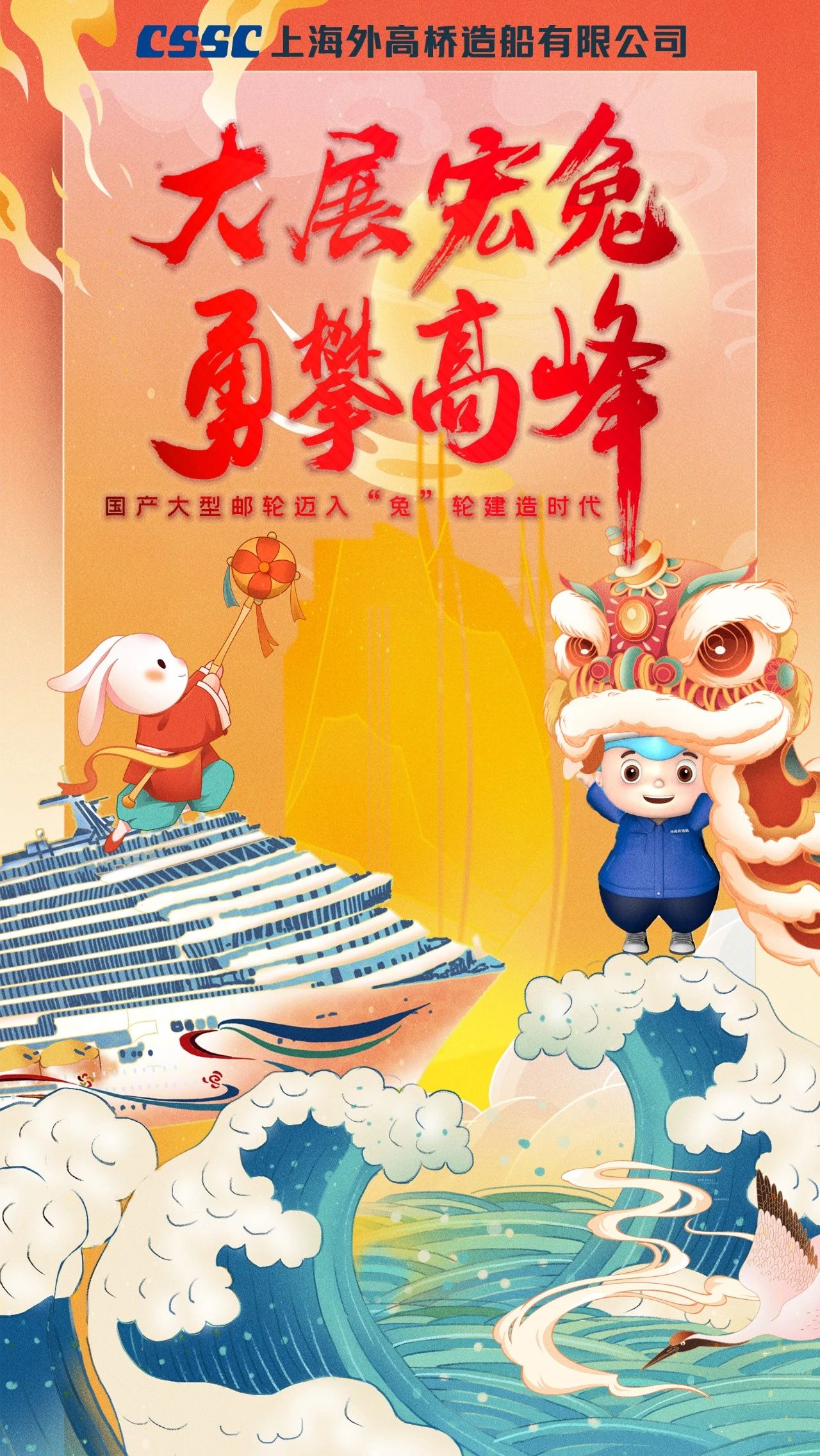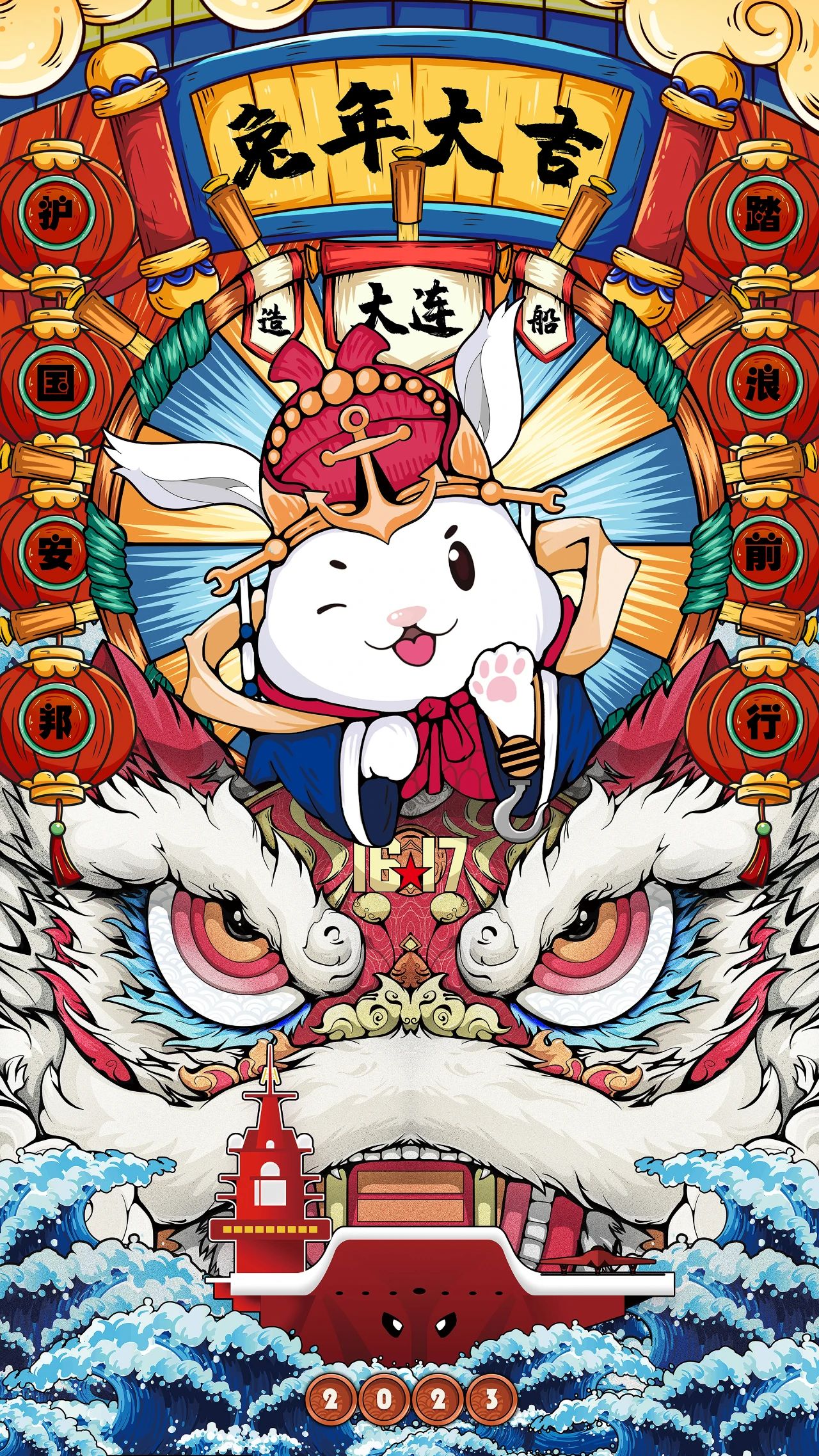 海報(bào)中所展現(xiàn)的元素,皆由大連造船元素組成,中間癸卯兔的頭冠裝飾以船錨、舵軸為主,下方航母在海中追風(fēng)逐浪,象征大連造船必將在新時(shí)代發(fā)展中踏浪前行。