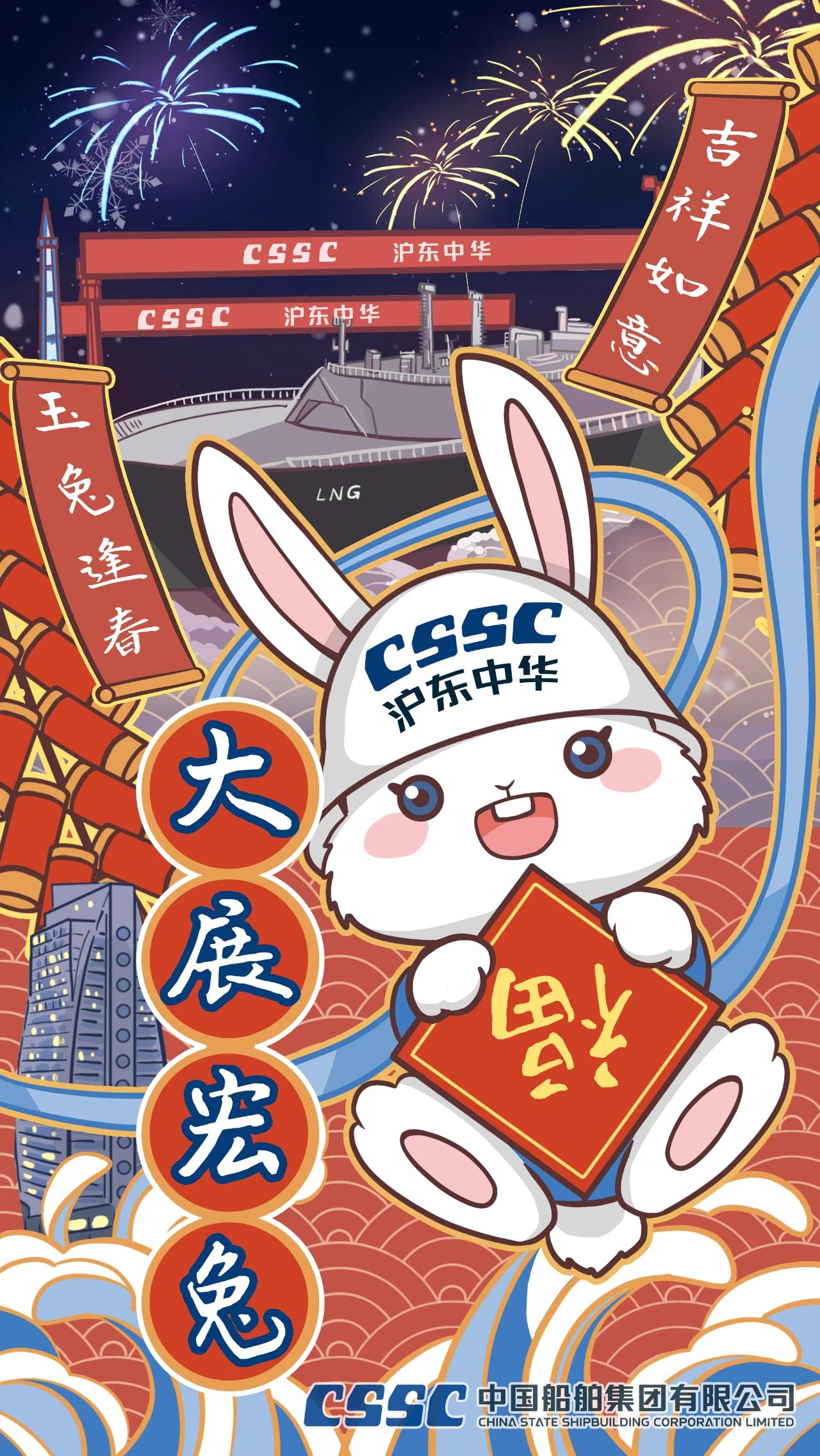 它采用插畫(huà)表現(xiàn)形式,勾勒出在煙花綻放的夜空下,滬東中華的龍門(mén)吊和LNG船等。玉兔逢春開(kāi)新局,2023,我們將繼續(xù)拼搏,展宏“兔”!