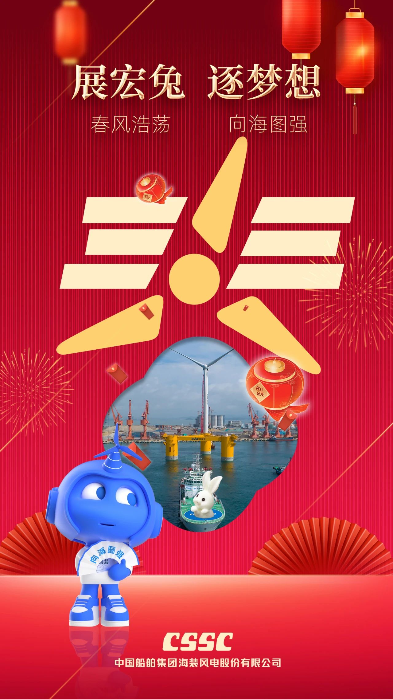海報(bào)主體部分以國(guó)內(nèi)首臺(tái)深遠(yuǎn)海浮式風(fēng)電裝備“扶搖號(hào)”為創(chuàng)意點(diǎn),通過(guò)含有“大風(fēng)車(chē)”形象的寫(xiě)意“春”字,表達(dá)中船海裝將在春風(fēng)浩蕩中大展宏“兔”,在向海圖強(qiáng)征程中矢志奮斗!