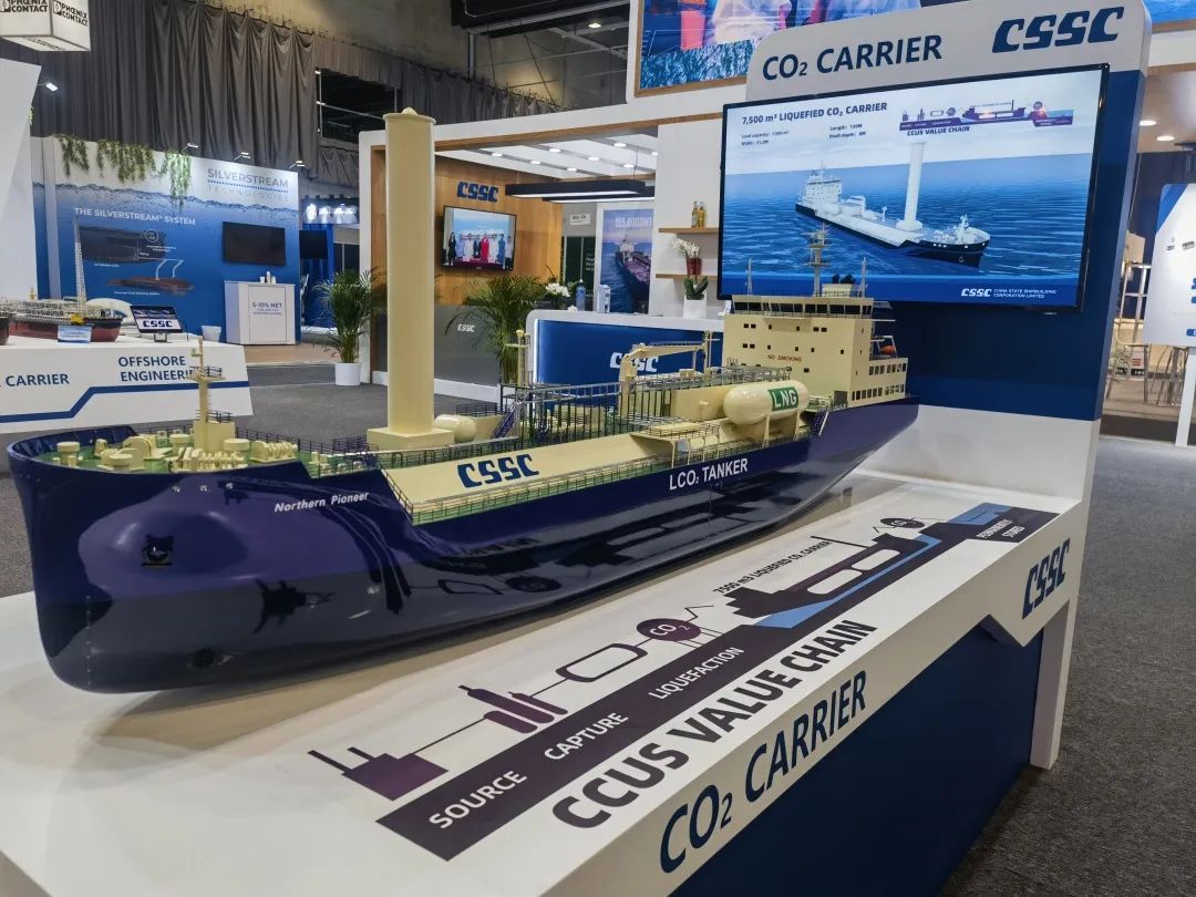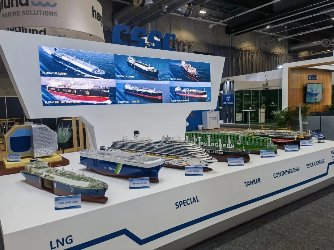 本次展會,中國船舶集團積極踐行“走出去”發(fā)展戰(zhàn)略,緊盯目標市場特點和需求,重點展示了近年來船舶海工及動力機電產(chǎn)品在綠色、低碳、環(huán)保方面取得的最新進展和相關(guān)成果,包括全球首制7500立方米液態(tài)二氧化碳運輸船、17.4萬立方米大型LNG運輸船、7000CEU雙燃料汽車滾裝船、23000TEU超大型雙燃料集裝箱船、21萬噸氨燃料散貨船、30萬噸級FPSO、全球首艘10萬噸級智慧養(yǎng)殖工船,以及 12X92DF雙燃料低速機、LNG供氣系統(tǒng)、船用碳捕捉系統(tǒng)等。集團公司展臺吸引了眾多國內(nèi)外知名船東、船級社、設(shè)備廠商等到訪觀摩,交流了當前市場熱點并探討了未來合作機遇。