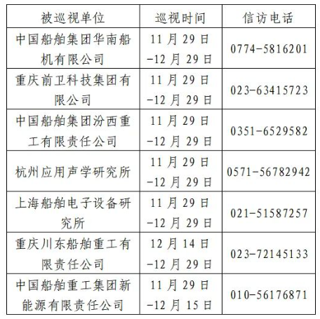 根據(jù)中國(guó)船舶集團(tuán)黨組2023年第二輪巡視工作部署,截至2023年11月29日,巡視工作已經(jīng)鋪開。其中,對(duì)中國(guó)船舶集團(tuán)華南船機(jī)有限公司、重慶前衛(wèi)科技集團(tuán)有限公司、中國(guó)船舶集團(tuán)汾西重工有限責(zé)任公司、杭州應(yīng)用聲學(xué)研究所、上海船舶電子設(shè)備研究所等5家單位開展常規(guī)巡視,對(duì)重慶川東船舶重工有限責(zé)任公司、中國(guó)船舶重工集團(tuán)新能源有限責(zé)任公司等2家單位開展專項(xiàng)巡視。