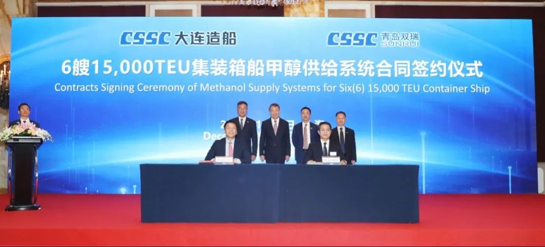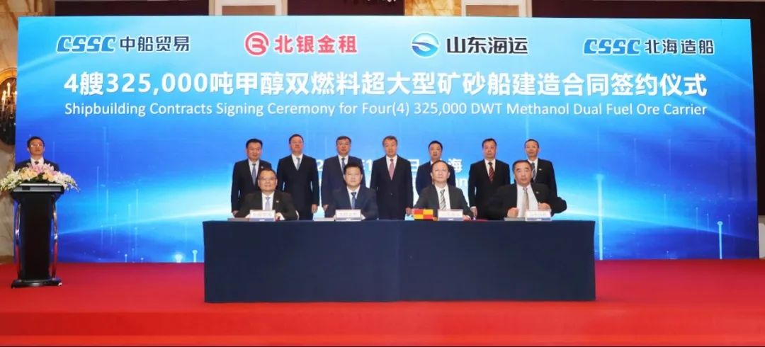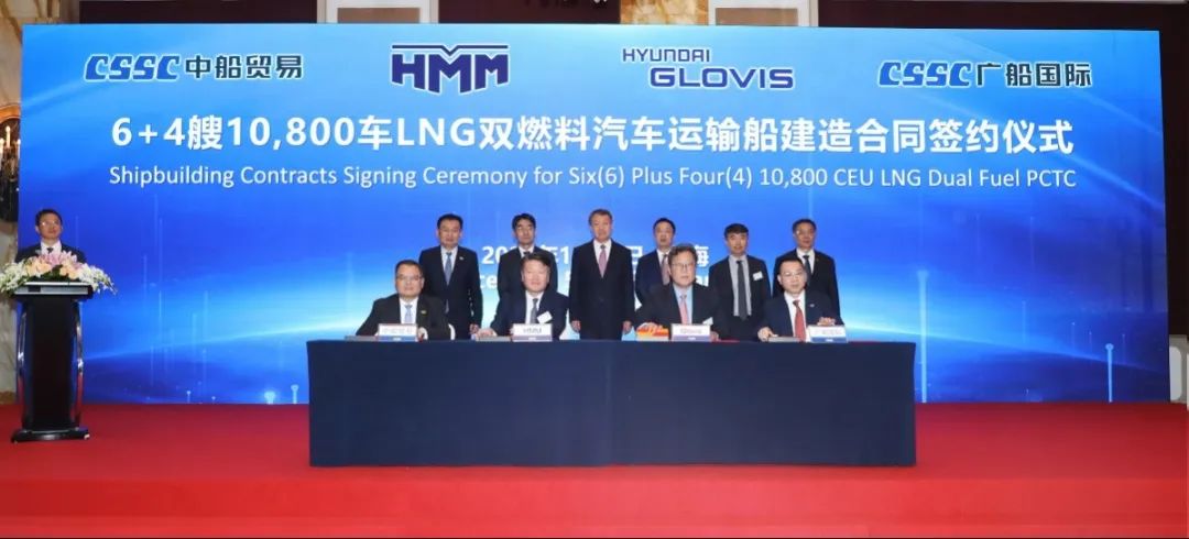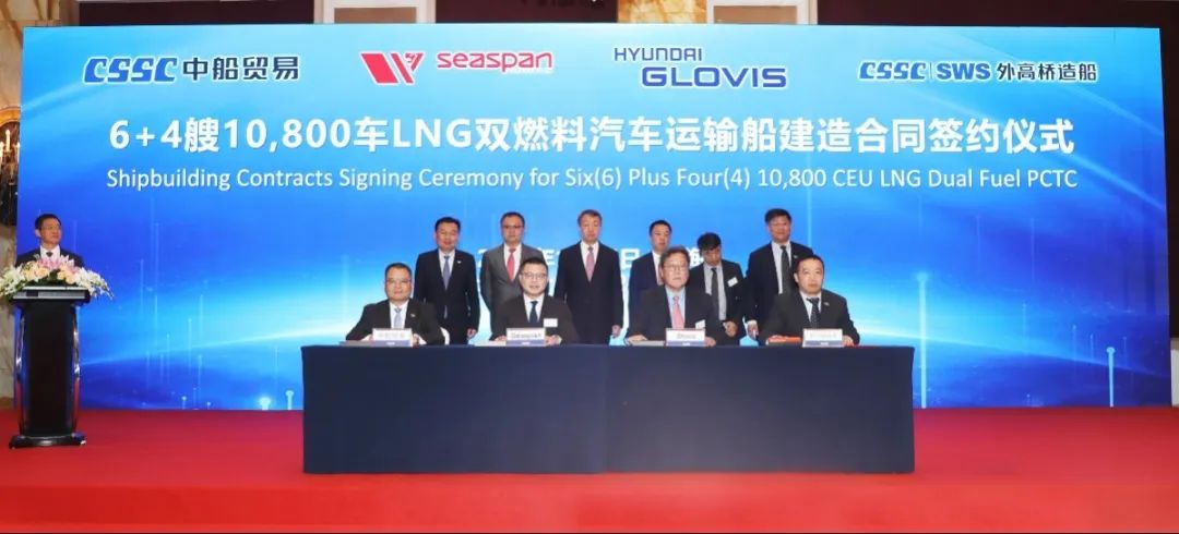 簽約儀式上,外高橋造船、中船貿(mào)易與Seaspan、現(xiàn)代Glovis簽署了6+4艘10800車(chē)LNG雙燃料PCTC船項(xiàng)目;廣船國(guó)際、中船貿(mào)易與HMM、現(xiàn)代Glovis簽署了6+4艘10800車(chē)LNG雙燃料PCTC船項(xiàng)目;北海造船、中船貿(mào)易與北銀金租、山東海運(yùn)簽署了4艘325000噸超?型甲醇雙燃料礦砂船項(xiàng)目;江南造船、中船貿(mào)易與太平洋氣體簽署了3艘99000方VLEC船項(xiàng)目;黃埔文沖、中船貿(mào)易與Benelux公司簽署了2+1艘48000方LPG船項(xiàng)目;中船澄西、中船貿(mào)易與工銀金租簽署了4艘82600噸散貨船項(xiàng)目;大連造船與七二五所青島雙瑞簽署了15000TEU集裝箱船甲醇供應(yīng)系統(tǒng)項(xiàng)目。