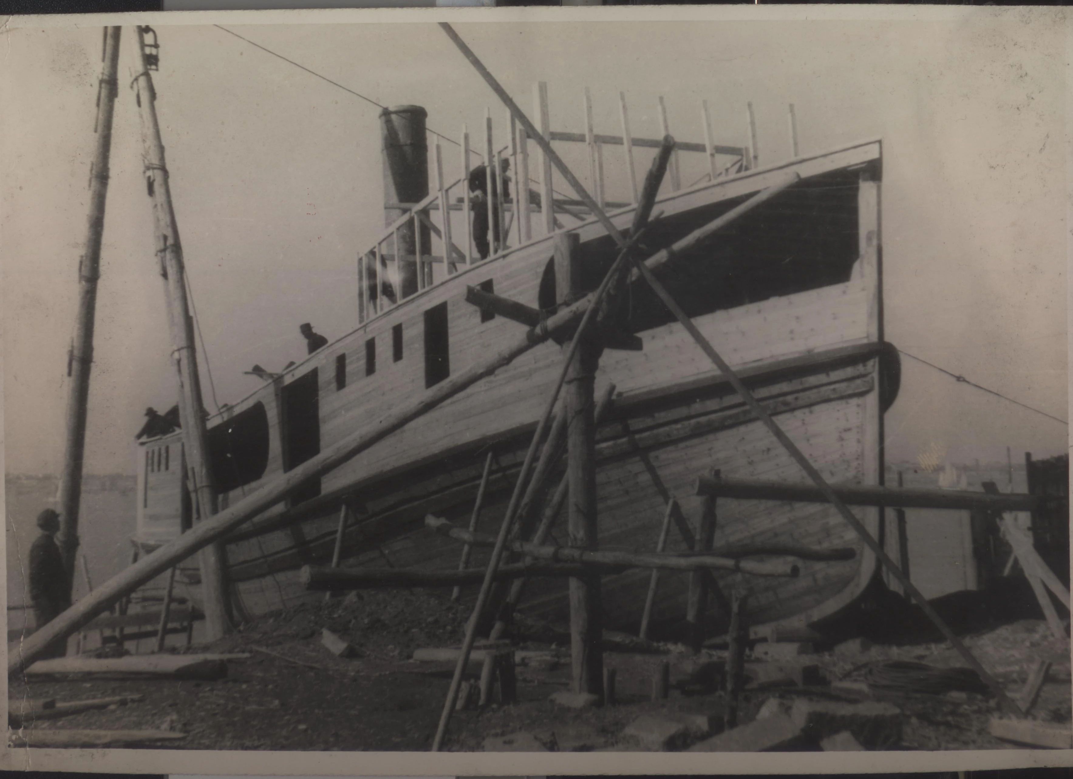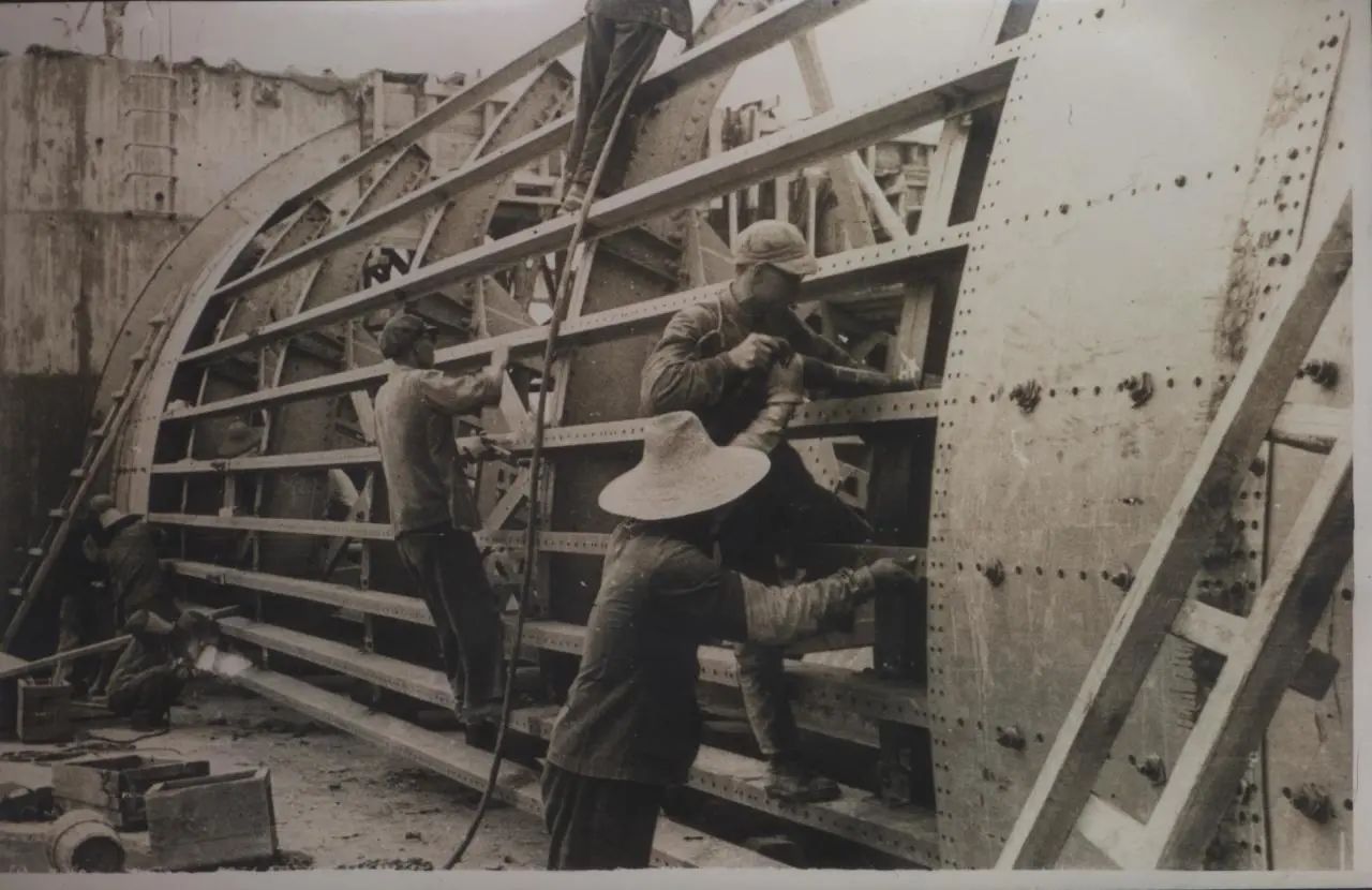 1934年武漢,上世紀(jì)30年代,武昌造船成立之初,工人們以手工作業(yè)“敲敲打打”形式開展修造船業(yè)務(wù)。修造的船只大多為100~300噸、鋼肋骨與木殼結(jié)構(gòu),僅有少量是鋼鉚接船體。建造的船只只能在長江上航行跑跑運(yùn)輸。為了生存和救國,船廠還建造一些農(nóng)用機(jī)械器具、槍支,以輔助民生、支援抗日。