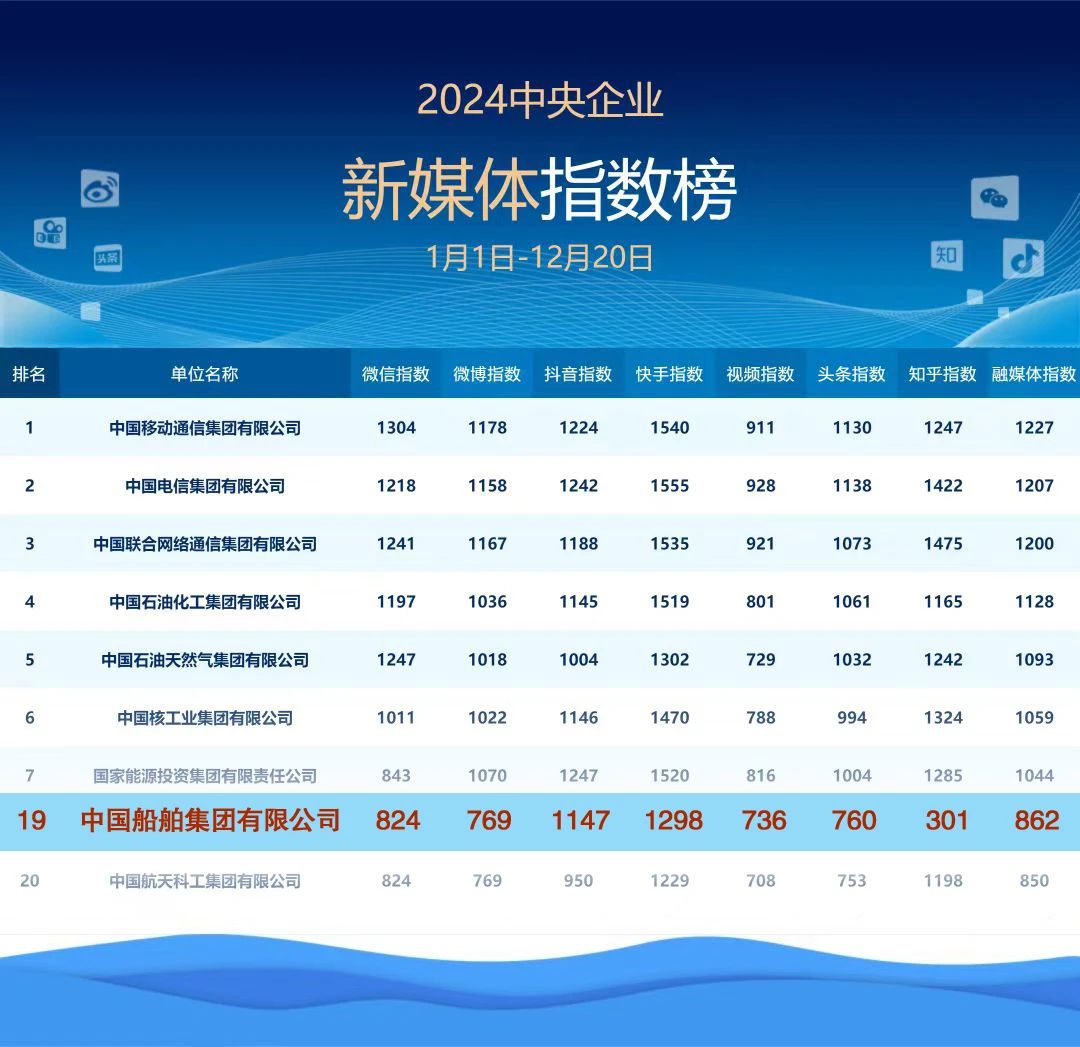 2024年——中船集團(tuán)新媒體平臺(tái)綜合指數(shù)進(jìn)入2024年度中央企業(yè)新媒體指數(shù)榜前20!