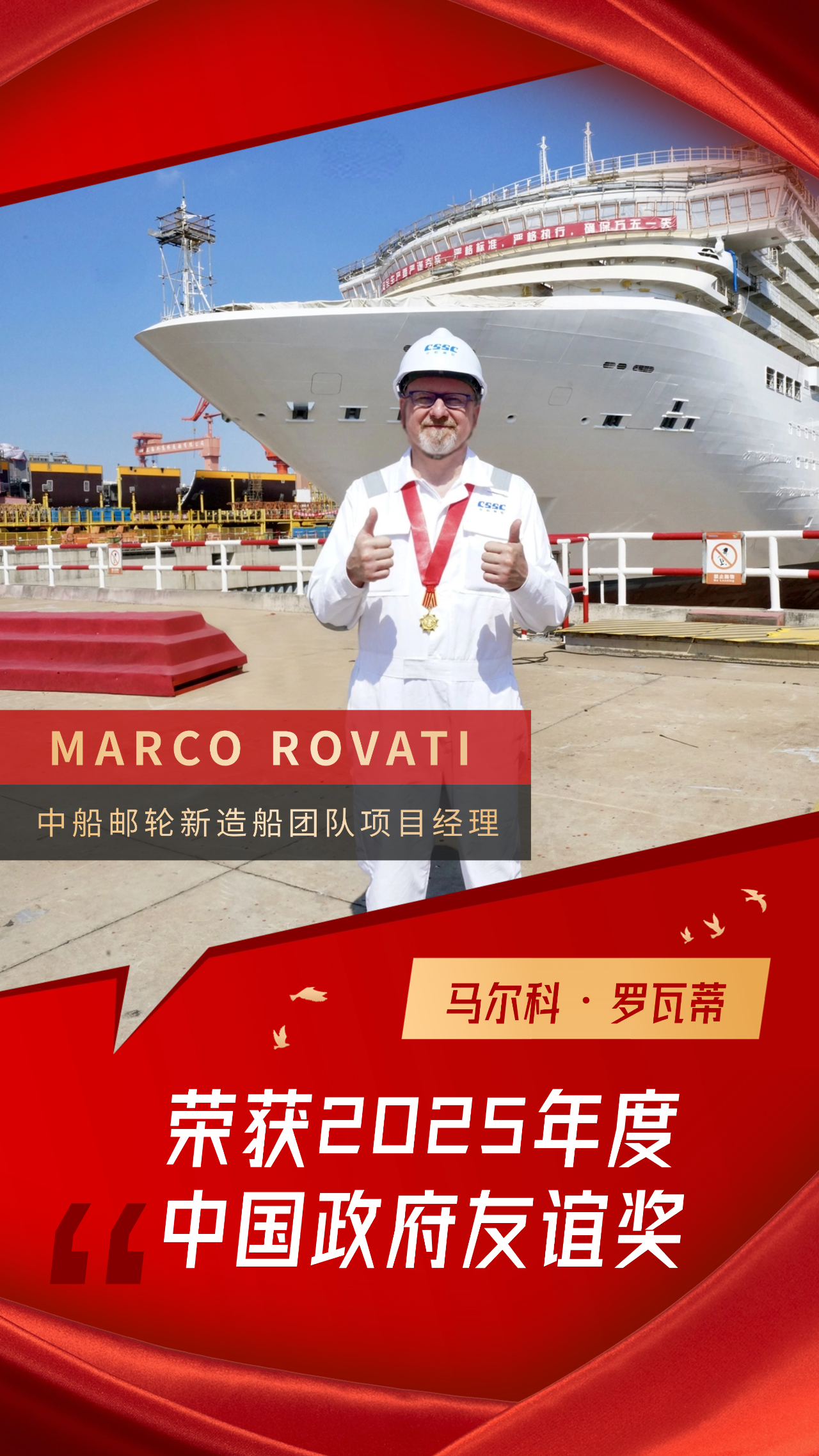 近日,2025年度中國政府友誼獎(jiǎng)?lì)C獎(jiǎng)儀式在人民大會(huì)堂隆重舉行,國務(wù)委員諶貽琴為獲獎(jiǎng)外國專家頒獎(jiǎng)。中國船舶集團(tuán)有限公司旗下中船郵輪新造船團(tuán)隊(duì)項(xiàng)目經(jīng)理 MARCO ROVATI(馬爾科?羅瓦蒂),因在推動(dòng)中國郵輪產(chǎn)業(yè)高質(zhì)量發(fā)展方面作出的突出貢獻(xiàn),榮獲此項(xiàng)國家級(jí)榮譽(yù)。