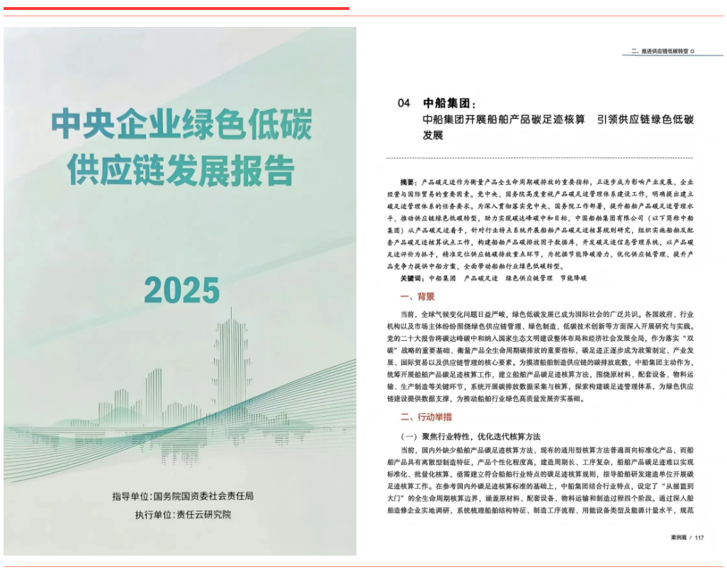 《中船集團開展船舶產(chǎn)品碳足跡核算引領(lǐng)綠色供應鏈低碳發(fā)展》聚焦船舶產(chǎn)品全生命周期碳足跡核算,構(gòu)建了行業(yè)首套核算規(guī)則與數(shù)據(jù)庫,有效帶動供應鏈上下游協(xié)同減排。該案例入選《中央企業(yè)綠色低碳供應鏈發(fā)展報告(2025)》。