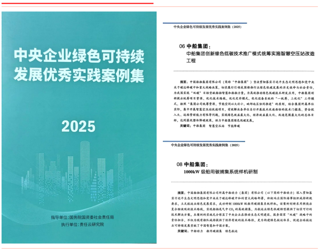 《中船集團創(chuàng)新綠色低碳技術(shù)推廣模式 統(tǒng)籌實施智慧空壓站改造工程》通過系統(tǒng)推進智慧空壓站改造,創(chuàng)新“一統(tǒng)籌、三優(yōu)化”模式,大幅提升設(shè)備能效?!吨写瑒恿?000kW級船用碳捕集系統(tǒng)樣機研制》圍繞船用碳捕集關(guān)鍵技術(shù)開展攻關(guān),采用燃燒后復合胺吸收工藝,實現(xiàn)CO?捕集率超85%、純度達99.9%。上述兩項案例入選《中央企業(yè)綠色可持續(xù)發(fā)展優(yōu)秀實踐案例集(2025)》。