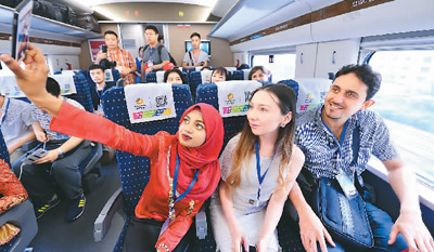 6月17日,100余名留學(xué)生從西安出發(fā),乘坐寶蘭高鐵試運(yùn)行動車組前往蘭州,初次體驗(yàn)即將開通運(yùn)營的首條貫通新絲路高鐵。圖為幾名外國留學(xué)生在動車組試驗(yàn)列車上自拍。唐振江攝(人民視覺)