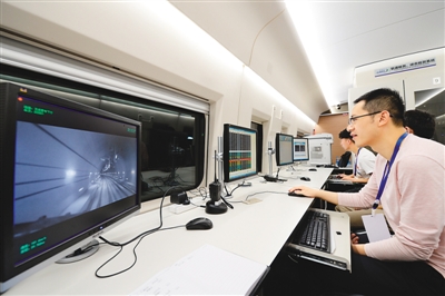 6月20日,西(安)成(都)高鐵陜西段聯(lián)調(diào)聯(lián)試正式啟動。圖為當(dāng)高速綜合檢測列車穿越秦嶺時,技術(shù)人員在監(jiān)測列車運(yùn)行數(shù)據(jù)。新華社記者 李一博攝