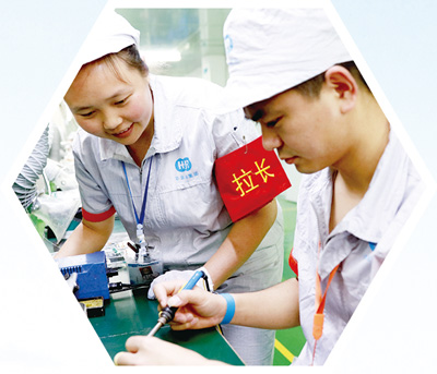 華鎣市一家企業(yè)的生產(chǎn)線負(fù)責(zé)人唐定燕(左),向徒弟講解生產(chǎn)技術(shù)。周松林?jǐn)z