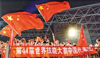 圖為日前在阿拉伯聯(lián)合酋長(zhǎng)國(guó)舉行的第44屆世界技能大賽開幕式上,人們揮舞著中國(guó)國(guó)旗歡迎中國(guó)代表團(tuán)入場(chǎng)。