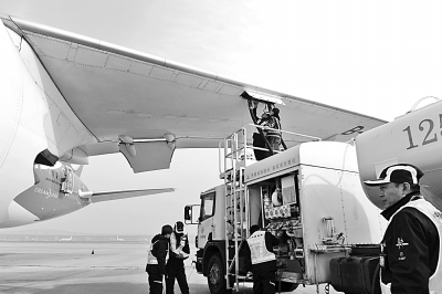 11月21日,在北京首都國(guó)際機(jī)場(chǎng),工作人員為海南航空HU497航班的波音787客機(jī)加注生物航煤。(新華社發(fā))
