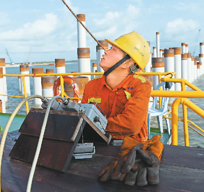 7月30日,在肯尼亞拉穆港,工作人員在中國(guó)交建“粵工樁11號(hào)”施工船上工作。(陳 誠 攝)