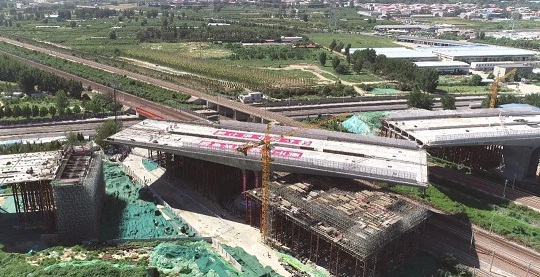 ????該工程上跨鄭焦城際、京廣鐵路等3條線5股道,每天有140對(duì)高鐵列車和貨運(yùn)列車擦肩而過(guò),轉(zhuǎn)體橋與鐵路線的最近距離只有8.7米,加上該工程橋梁全長(zhǎng)317米,寬38.7米,轉(zhuǎn)體懸臂長(zhǎng)71.75米,單側(cè)轉(zhuǎn)體橋梁重達(dá)3萬(wàn)噸,鐵路東、西兩側(cè)轉(zhuǎn)體橋梁總重達(dá)6萬(wàn)噸,體量大,風(fēng)險(xiǎn)高,施工難度可想而知。為確保總重量達(dá)6萬(wàn)噸的轉(zhuǎn)體橋精準(zhǔn)對(duì)接,重點(diǎn)在于球鉸的制作、安裝,轉(zhuǎn)體過(guò)程中應(yīng)力應(yīng)變、位移與線性的實(shí)時(shí)監(jiān)測(cè)。本次成功應(yīng)用的轉(zhuǎn)動(dòng)體系采用鋼球鉸,由雙瑞特裝設(shè)計(jì)、制造、安裝及轉(zhuǎn)體施工,解決了大噸位橋梁轉(zhuǎn)體裝置超大承載力,靈活轉(zhuǎn)動(dòng)的難題。