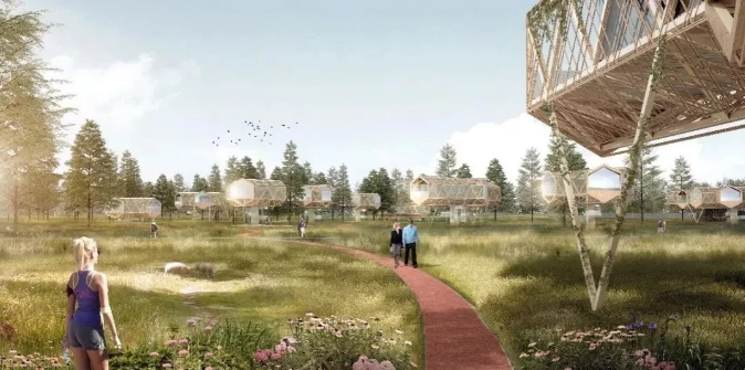 ????“棠上人家”方案以“浮木”為概念,旨在創(chuàng)造一種漂浮于自然之上、如樹木般生長的建筑形態(tài)。設計以鄉(xiāng)村建設的天然環(huán)境保護和不規(guī)則點狀供地特點為切入點,提出立足鄉(xiāng)村、面向未來的輕型建造策略,對結(jié)構(gòu)選型、空間組合、表皮構(gòu)造等方面進行研究,打造綠色生態(tài)的新型鄉(xiāng)村建筑形態(tài)。