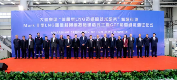 ????2019年11月26日,大船集團(tuán)舉行“薄膜型LNG運(yùn)輸船技術(shù)研究”科研專項(xiàng)MarkⅢ型LNG船全封閉模擬艙建造完工暨GTT和船級(jí)社頒證儀式。法國(guó)GTT公司、英國(guó)勞式船級(jí)社和中國(guó)船級(jí)社代表在模擬艙建造現(xiàn)場(chǎng)向大船集團(tuán)代表頒發(fā)證書。