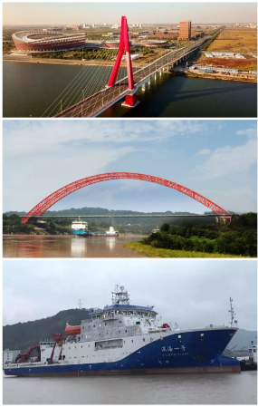????上圖所示均為武船集團(tuán)承建的項(xiàng)目。圖1:遼寧盤(pán)錦遼濱沿海經(jīng)濟(jì)開(kāi)發(fā)區(qū)大橋;圖2:四川合江長(zhǎng)江一橋;圖3:我國(guó)自主研制的第一艘載人潛水器支持母船“深海一號(hào)”。
