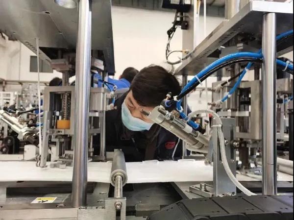 ????就在幾天前,鵬力智造已交付首批口罩機及防護服壓條機。此次交付的N95口罩機由鼻梁焊接機、打片機、耳帶焊接機三部分構(gòu)成,可生產(chǎn)多種類型折疊口罩,單臺設(shè)備每分鐘最高生產(chǎn)60只口罩。