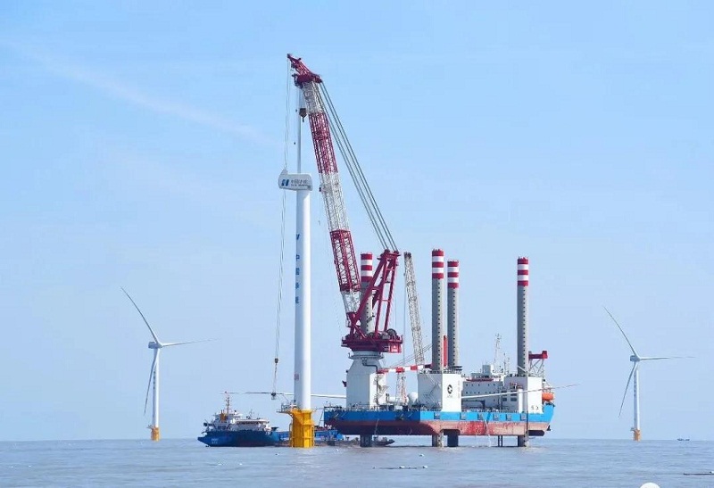 ????本次安裝難度大,30號風機單葉片長73.5米,旋轉(zhuǎn)直徑達158米,輪轂高度81米。塔筒共分為底、中、頂三段,風機整體總重量790噸以上,相當于500余輛小汽車的重量?!罢窠枴逼脚_安裝3臺1800千瓦電力推進全回轉(zhuǎn)舵槳,配備3臺750千瓦艏側(cè)推裝置。航速7節(jié),續(xù)航能力達3000海里,定員100人,平臺最大作業(yè)水深50米,甲板作業(yè)面積約2500平方米,可容納3套6兆瓦級風機或2套8兆瓦級風機,并且可以獨立完成6兆瓦、8兆瓦級風機的安裝和其他水上工程施工的起重、打樁、吊裝和運輸?shù)茸鳂I(yè)。