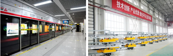 左圖:鄭州地鐵1號線使用七一三所軌道交通站臺門系統(tǒng);右圖:七一三所軌道交通站臺門門機系統(tǒng)生產(chǎn)現(xiàn)場