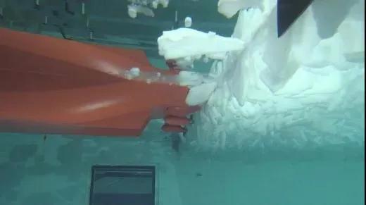 通過先后兩次的冰模試驗,全面測試了在北極航行船只的破冰工況,包含中厚陳年冰航道開辟試驗、航道突破試驗、流冰試驗和冰脊穿越試驗。