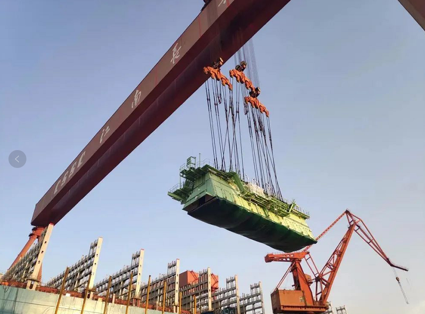????日前,中國(guó)船舶集團(tuán)旗下滬東中華順利完成23000TEU集裝箱船3號(hào)船的主機(jī)吊裝工作,標(biāo)志著該船向出塢邁出最關(guān)鍵一步。主機(jī)吊裝整個(gè)過(guò)程用時(shí)不到5天,同時(shí)取得僅用2.5天就完成5大件吊裝的新突破,為同行業(yè)系列船最短紀(jì)錄。