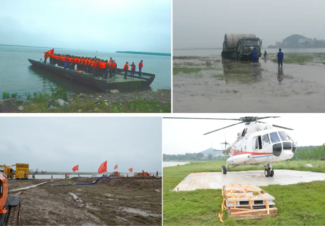 ????在搜救環(huán)節(jié),中船應(yīng)急搶險(xiǎn)隊(duì)架設(shè)動力舟橋和硬質(zhì)機(jī)動路面進(jìn)行道路搶通,保障重型裝備及人員進(jìn)場;在內(nèi)澇搶排環(huán)節(jié),采用應(yīng)急泄流虹吸裝備和履帶式排澇機(jī)器人參與排澇搶險(xiǎn);在重大險(xiǎn)情處置環(huán)節(jié),鋪設(shè)應(yīng)急直升機(jī)停機(jī)坪保障直升機(jī)起降,并實(shí)施潰口封堵作業(yè)。