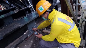 泛廣公司員工在香港大埔運動場工地檢測油漆厚度