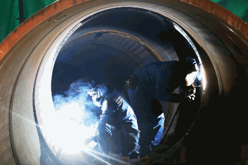 廣船國際首個(gè)吸力筒導(dǎo)管架風(fēng)機(jī)基礎(chǔ)施工現(xiàn)場,技術(shù)工人正在進(jìn)行管子焊接作業(yè)。