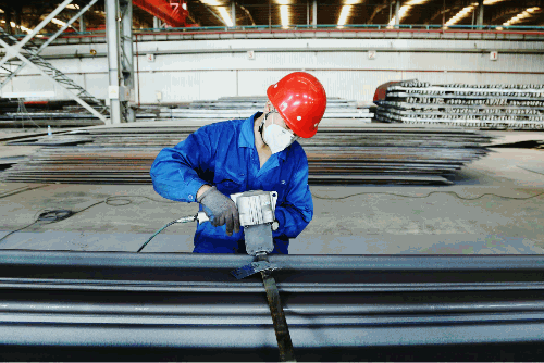 物資公司下屬鞍山公司預(yù)處理車間現(xiàn)場,中午最高可達(dá)40°C,工作人員正在進(jìn)行型材預(yù)處理作業(yè),保質(zhì)保量完成物資供應(yīng)。