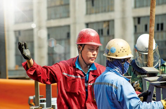 午后,吊裝工人董師傅在烈日下指揮吊運(yùn)。