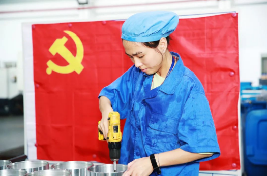 七二六所車間,在黨旗的輝映下,機(jī)加工車間,鉗床組張師傅正在緊張地加工零件和毛刺修整,早已顧不上汗水的洗禮。