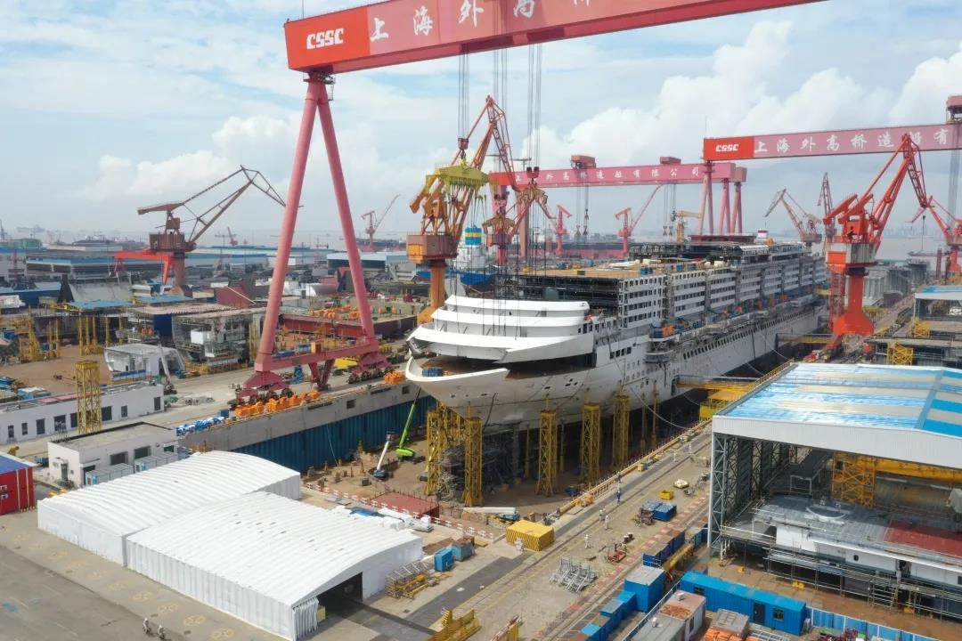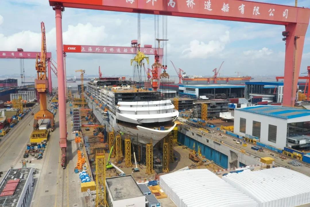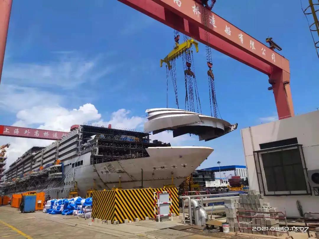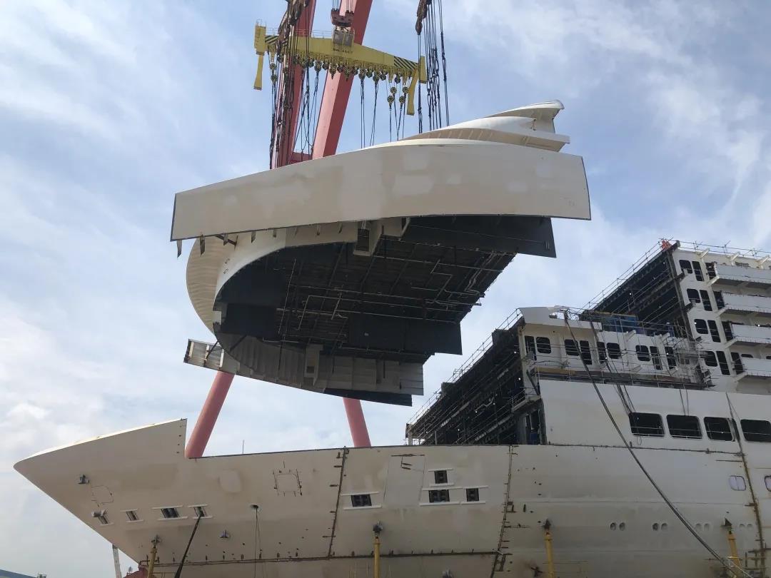 國產(chǎn)首制大型郵輪完成首個艏部總段吊裝! 預(yù)計9月實現(xiàn)全船結(jié)構(gòu)貫通。
