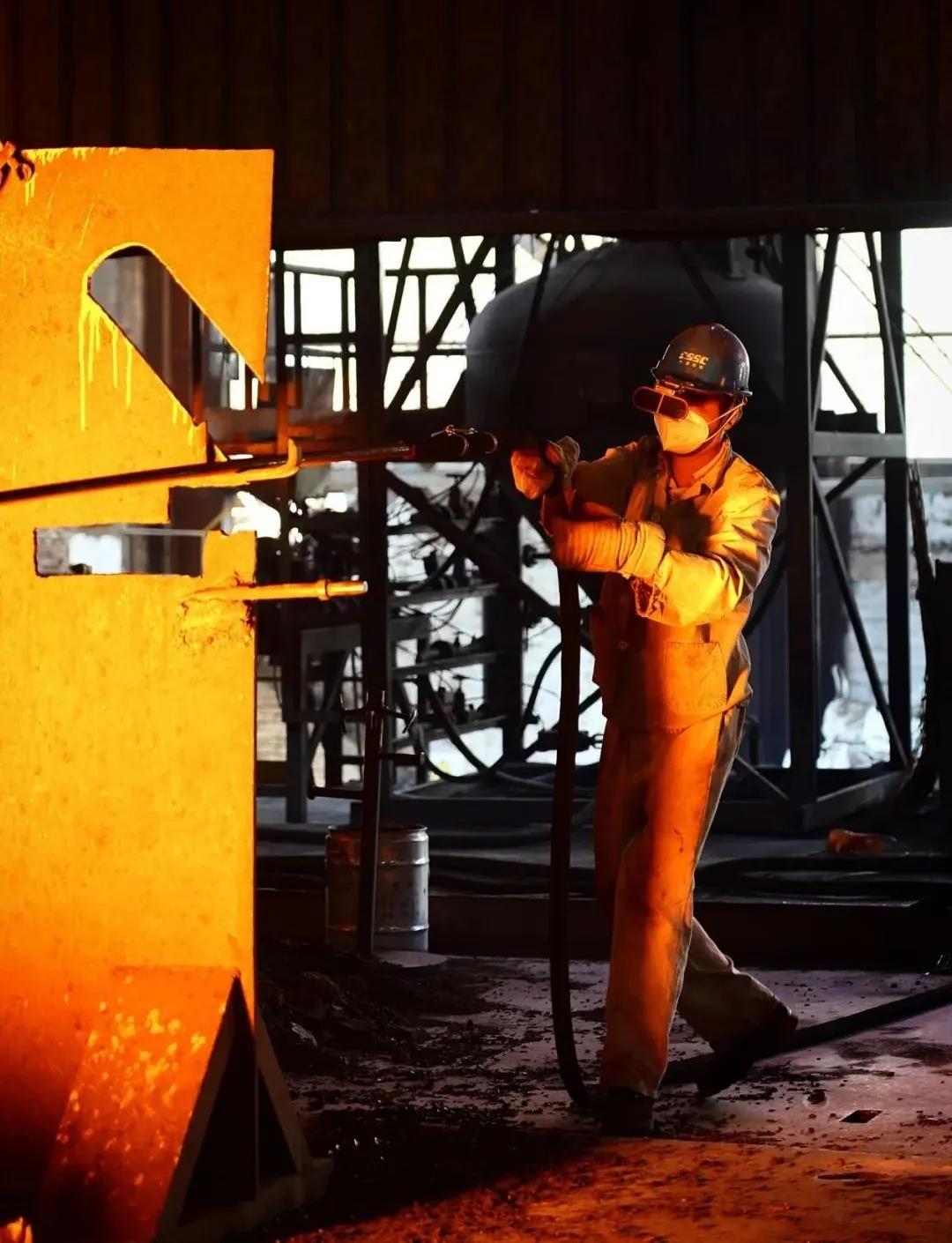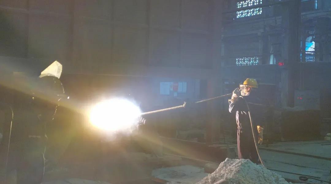 煉鋼工人為確保鋼水質量,提高生產(chǎn)效率進行吹氧工序,鋼水溫度達1600余攝氏度。