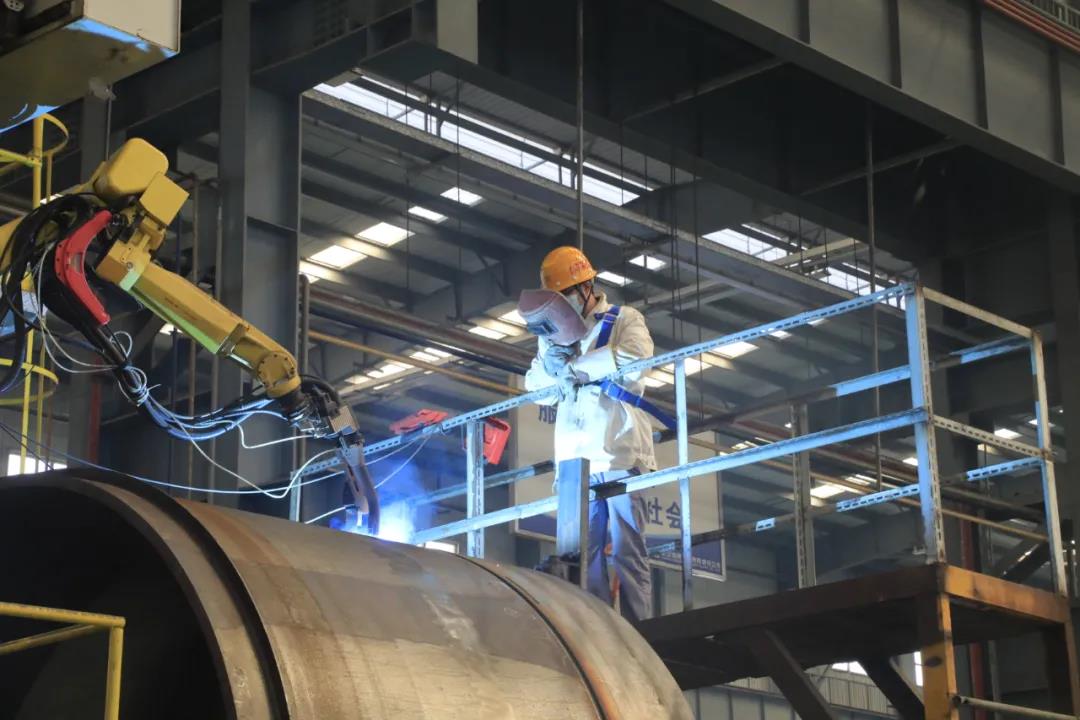 武漢船機鋼構制造部員工正在操作焊接機器人焊接海工產(chǎn)品結構件。