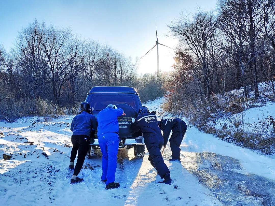 進(jìn)入11月,內(nèi)蒙古自治區(qū)錫林郭勒盟地區(qū)迎來(lái)大面積的暴風(fēng)雪,烏達(dá)萊項(xiàng)目人員在趕往風(fēng)場(chǎng)的路上遭遇積雪路段,雖然氣候嚴(yán)寒,但為了及時(shí)消除機(jī)組故障,大家在積雪路段采取挖雪推車的方式齊心協(xié)力,一同開(kāi)展清理路面積雪的行動(dòng)。這個(gè)冬日,冰雪阻擋不住海裝追風(fēng)者們勇往直前的步伐,他們只為恪盡職守完成一個(gè)承諾——風(fēng)機(jī)旋轉(zhuǎn)、帶來(lái)光熱。