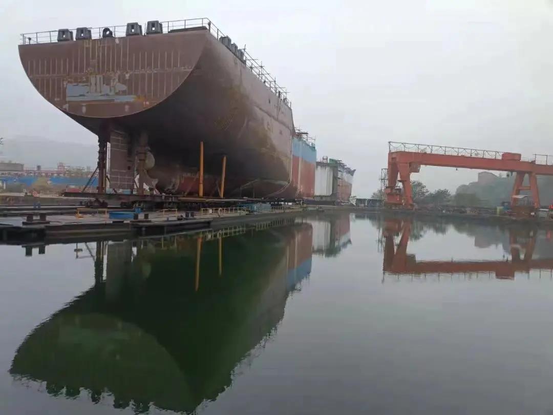 該公司在建的8000噸不銹鋼化學(xué)品船1號(hào)船艉總段拖移到位。